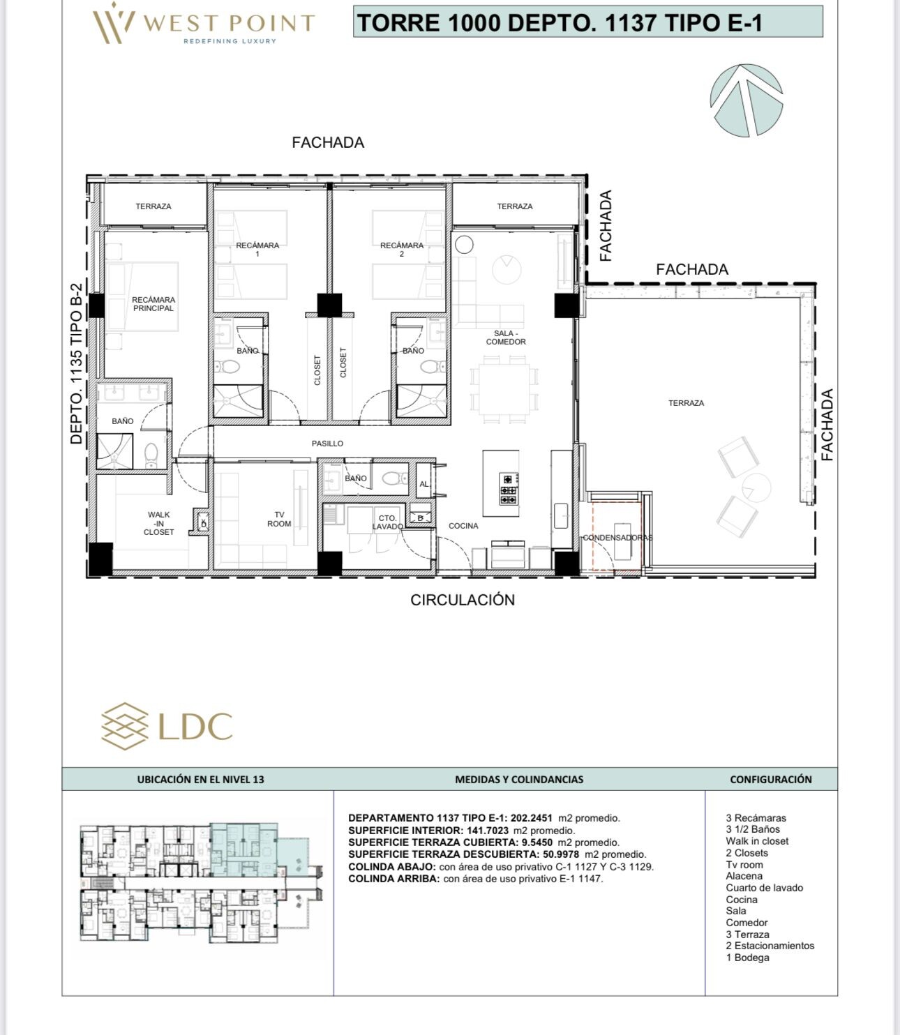 Con 19 pisos la torre cuenta con 125 lujosos departamentos de 1,2 y 3 recamaras cuya superficie va desde los 59.75 m2 hasta los 262.83 m2