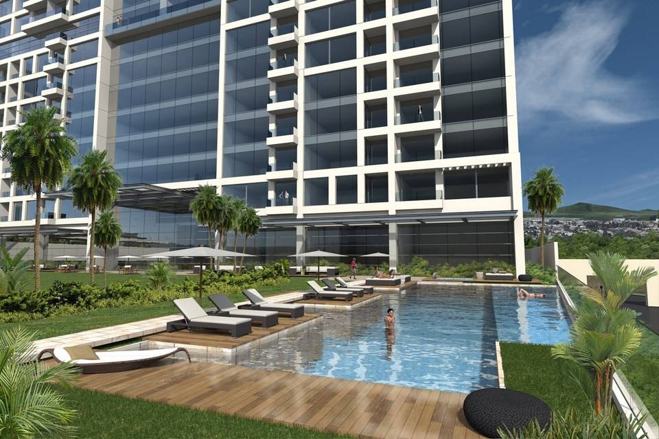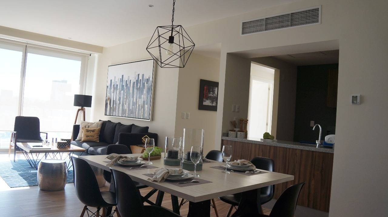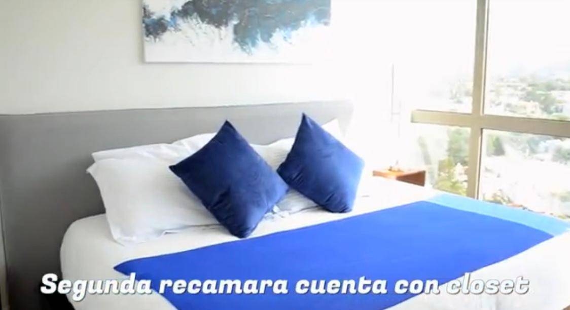 El departamento cuenta con; sala y comedor, cocina integral con barra, terraza, 2 recámaras con baño, la principal con closet vestidor. La torre cuenta tiene acceso controlado, seguridad 24 horas, Sky bar, salón de usos múltiples, alberca y gimnasio, jacuzzy, boliche , cine, áreas verdes, salón de juegos, salón infantil, Lobby, salón de juntas. Piso 9